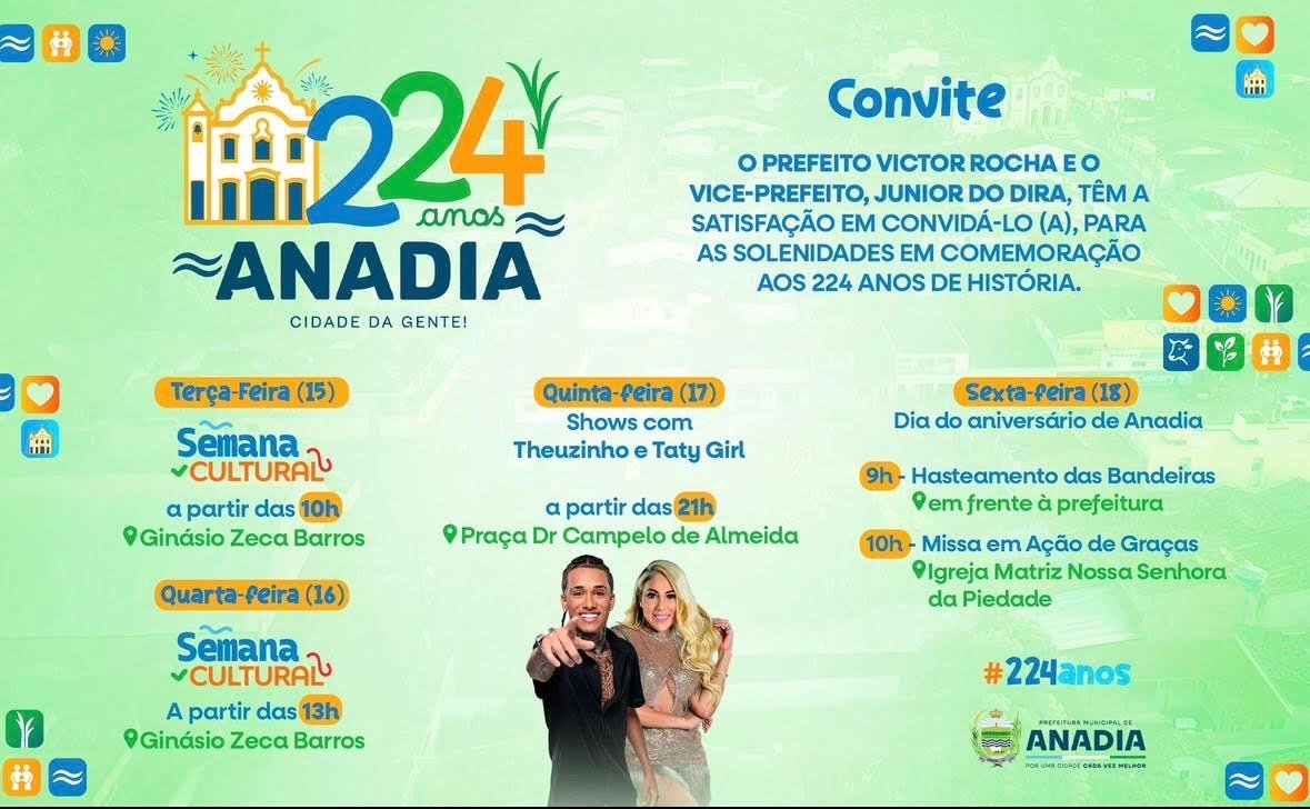 Para o prefeito Victor Rocha, a iniciativa, que já faz parte do calendário festivo em comemoração ao aniversário de Anadia, deve ser incentivada e valorizada. “São 224 anos de história; e, como não poderia deixar de ser, a Semana Cultural fará parte da programação. Já fui secretário de cultura e sei da importância em apoiarmos as nossas raízes e tradições. Não tenho dúvidas que teremos belíssimas e emocionantes apresentações. Estão todos convidados”, disse.