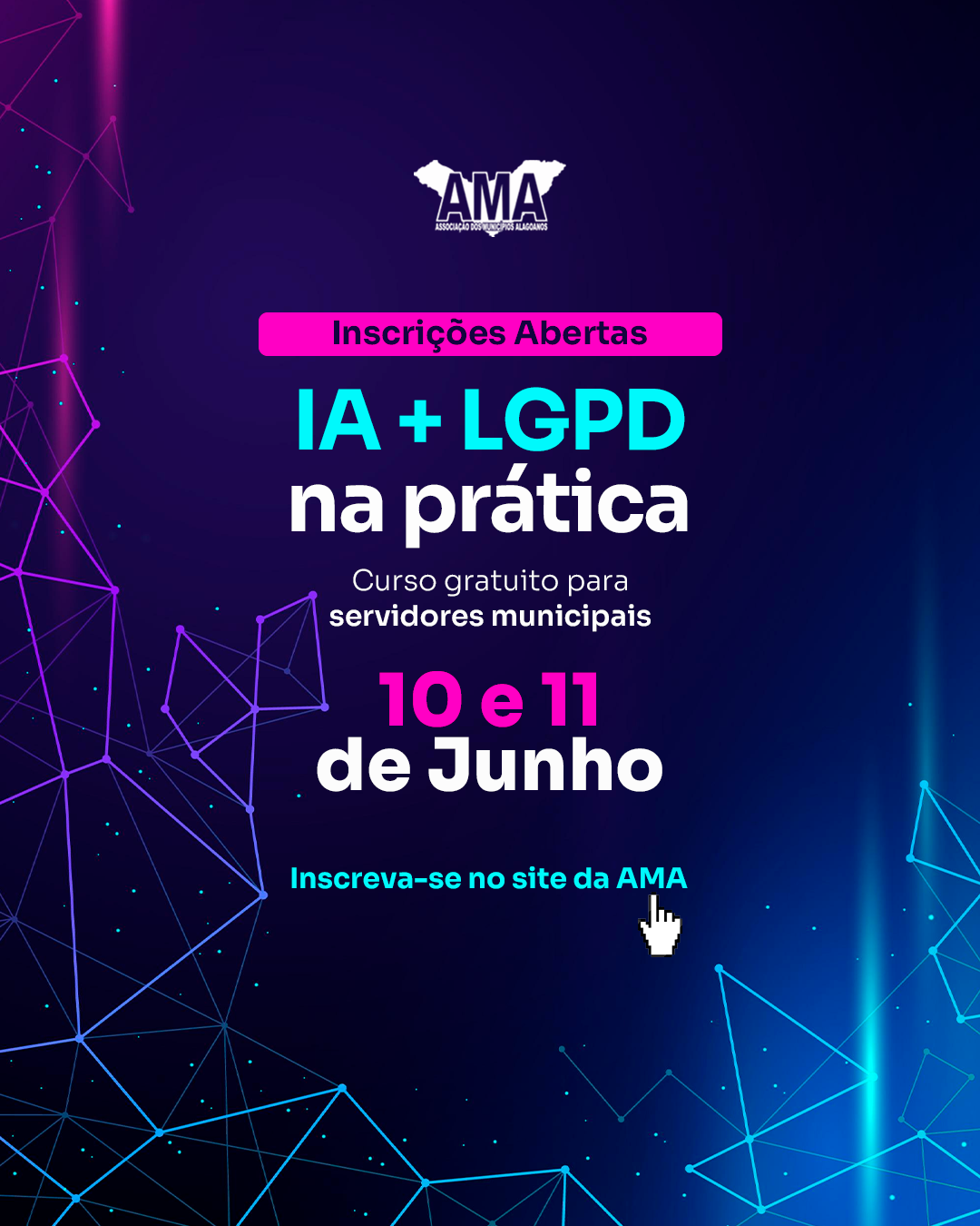 A Associação dos Municípios Alagoanos (AMA) está com inscrições abertas para mais um curso gratuito e exclusivo voltado à qualificação das gestões municipais. Nos dias 10 e 11 de junho, será realizada a capacitação “Inteligência Artificial e Proteção de Dados para Municípios”, com foco em orientar servidores públicos sobre os desafios e oportunidades no uso da tecnologia na administração pública.