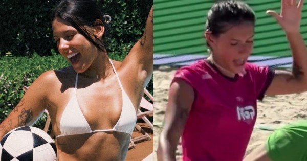 Ana Castela tira onda de biquíni e desce até o chão durante futevôlei; vídeos