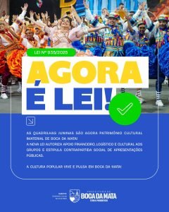 O município de Boca da Mata deu um passo importante na valorização da cultura popular com a sanção da Lei Municipal nº 935/2025, que reconhece oficialmente as quadrilhas juninas como patrimônio cultural imaterial do município. A medida também autorizou a criação de uma política pública de fomento financeiro, logístico e cultural aos grupos de quadrilha, consolidando um compromisso do poder público com a preservação das tradições juninas.