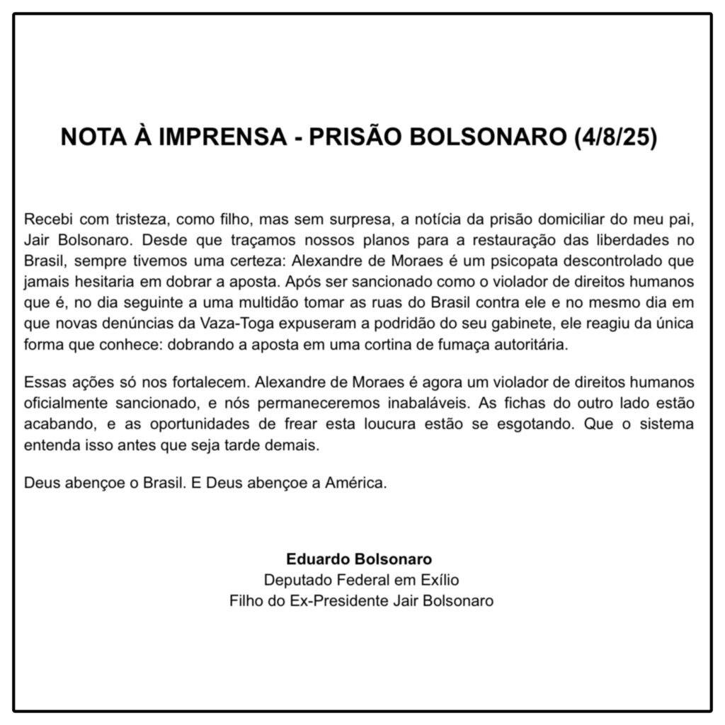 Eduardo encerrou a nota com um apelo religioso: “Deus abençoe o Brasil. E Deus abençoe a América”. A família Bolsonaro e aliados têm mantido um discurso de enfrentamento ao STF, classificando as decisões judiciais como perseguição política.