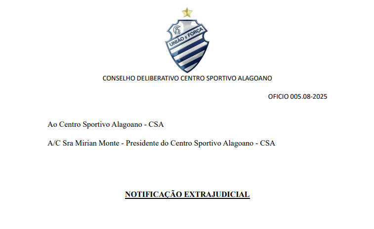 O Presidente do Conselho Deliberativo do Centro Sportivo Alagoano (CSA) emitiu uma nota extrajudicial exigindo, no prazo de 24 horas, a apresentação de documentos e informações referentes a declarações públicas feitas por um ex-dirigente do clube. O ex-membro, que já presidiu tanto a Diretoria Executiva quanto o próprio Conselho Deliberativo, teria afirmado que “irá desembuchar”, prometendo revelar “uma série de ilegalidades” e apresentar uma auditoria supostamente realizada no passado.