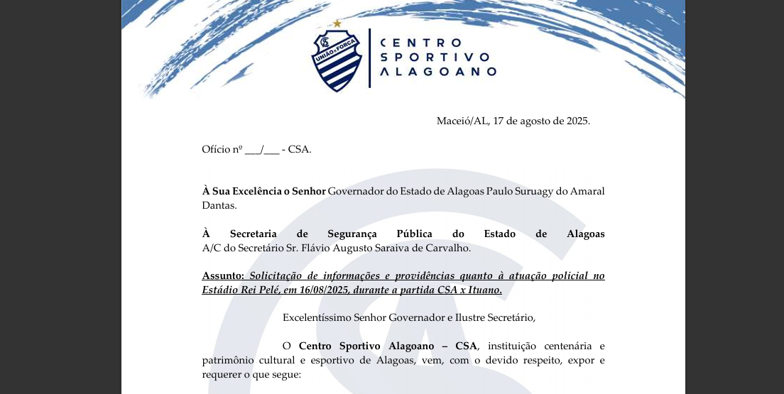 O Centro Sportivo Alagoano (CSA) formalizou, neste domingo (17), o envio de um ofício ao Governo de Alagoas exigindo providências diante dos episódios de violência registrados no Estádio Rei Pelé, em Maceió, após o empate por 2 a 2 contra o Ituano pela Série C. A medida foi tomada após diversos relatos de torcedores que afirmam ter sido agredidos por policiais militares durante a confusão que se seguiu à anulação de um gol nos minutos finais da partida.