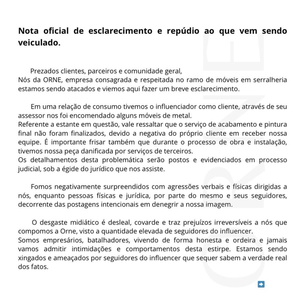Segundo a empresa, o contato com o influenciador ocorreu por meio de um assessor, que encomendou móveis de metal. Entre os itens solicitados estava uma estante, cujo serviço de acabamento e pintura final não foi concluído, de acordo com a ORNE, devido à negativa do próprio cliente em receber a equipe para a finalização.