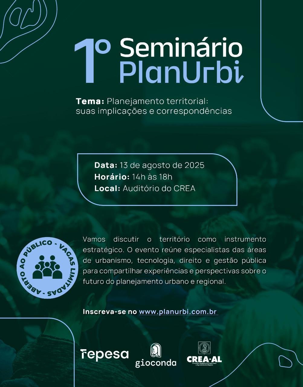 A Fundação de Apoio ao Ensino, Pesquisa e Extensão de Alagoas (FEPESA) realiza no dia 13 de agosto, a partir das 14h, no auditório do CREA/AL, o I Seminário PlanUrbi – Planejamento Urbano Inteligente, com o objetivo de promover o diálogo técnico e interdisciplinar sobre os desafios e caminhos possíveis para a construção de cidades mais inteligentes, sustentáveis e inclusivas.