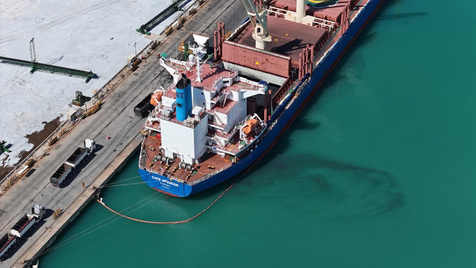 O material derramado foi identificado como petcoque, que, mesmo com baixo teor de toxinas, o contato direto com o ambiente marinho representa risco à fauna, à flora e à qualidade da água.