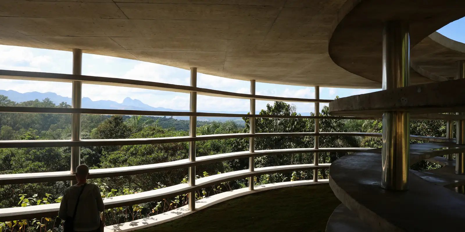 Sobre um dos pontos mais altos de Inhotim, a escultura monumental Contraplano faz referência ao prédio projetado pelo arquiteto Oscar Niemeyer na Praça da Liberdade, na capital mineira. Feita de lâminas de concreto armado e colunas de aço inoxidável, materiais usados na arquitetura moderna, a obra se descortina sobre áreas do jardim do museu e da mata no entorno e sobre fragmentos de cavas de mineração nas regiões próximas.