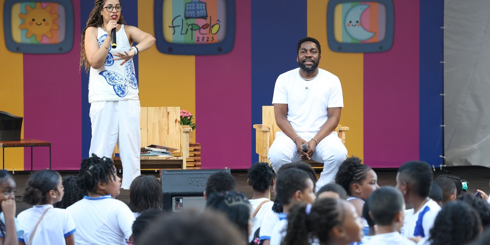 Jovens e crianças se juntam na Flipelô para conversar com Lázaro Ramos