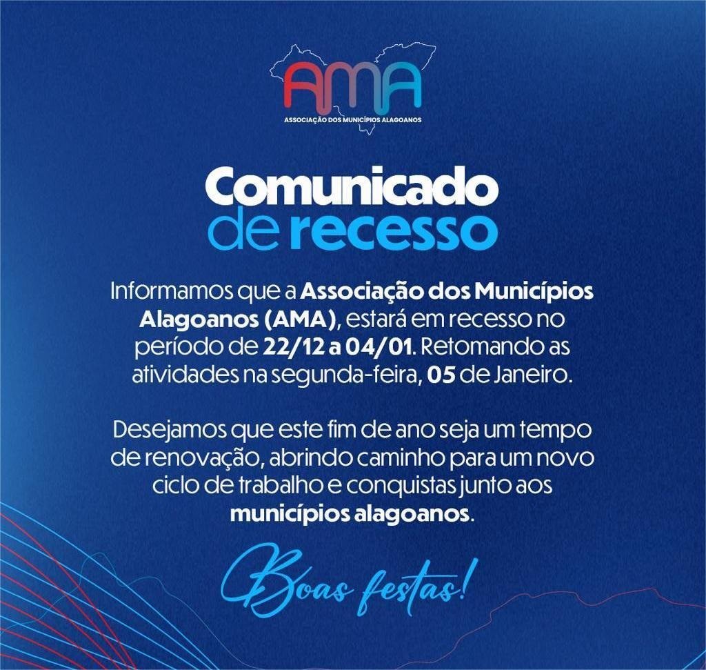 A Associação dos Municípios Alagoanos (AMA) informa que, a partir da segunda-feira, dia 22, a instituição entrará em recesso em virtude das festas de final de ano.