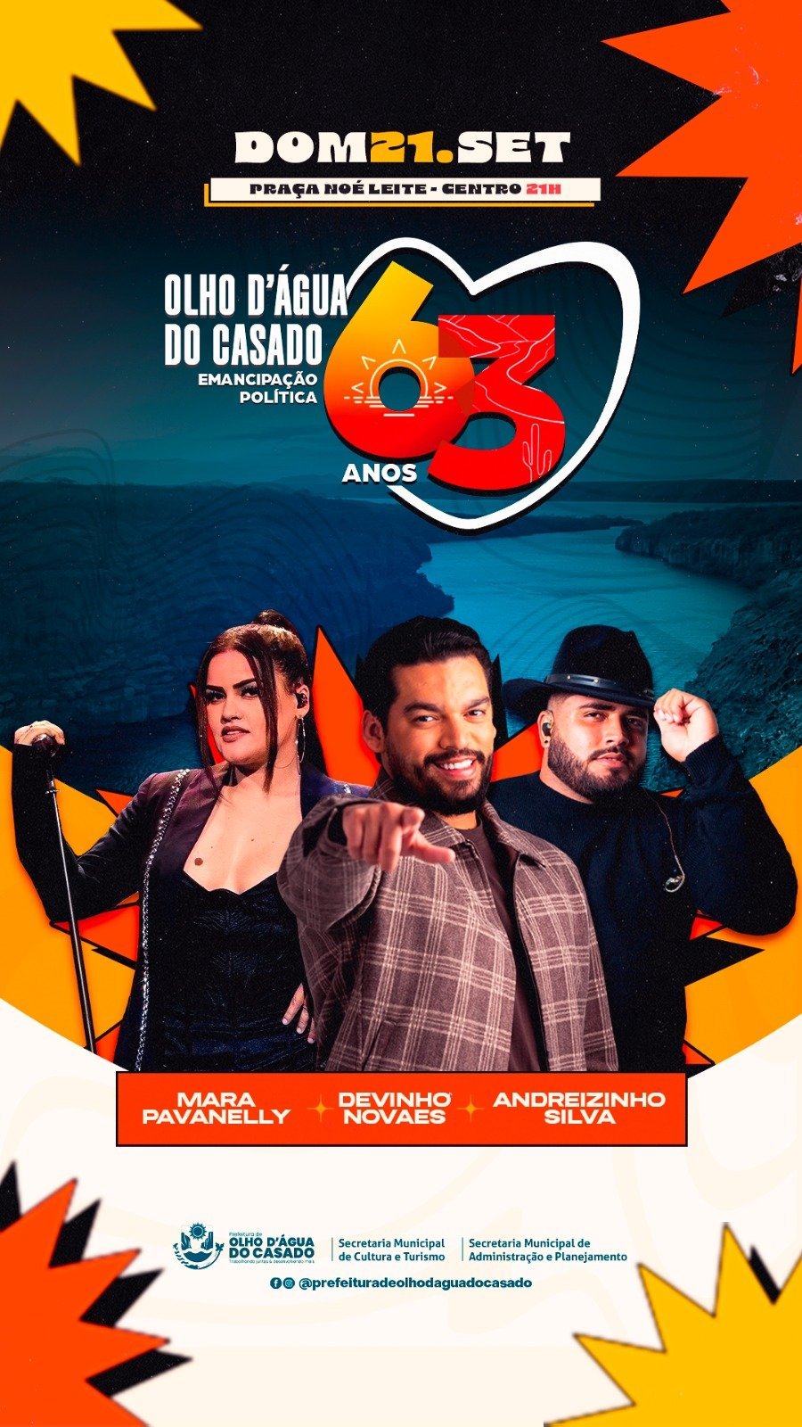 A cidade de Olho d’Água do Casado, conhecida como o “Portal dos Cânions”, se prepara para comemorar seus 63 anos de emancipação política em grande estilo. A festa oficial será realizada no próximo dia 21 de setembro, a partir das 21h, na Praça Noé Leite, no centro do município.