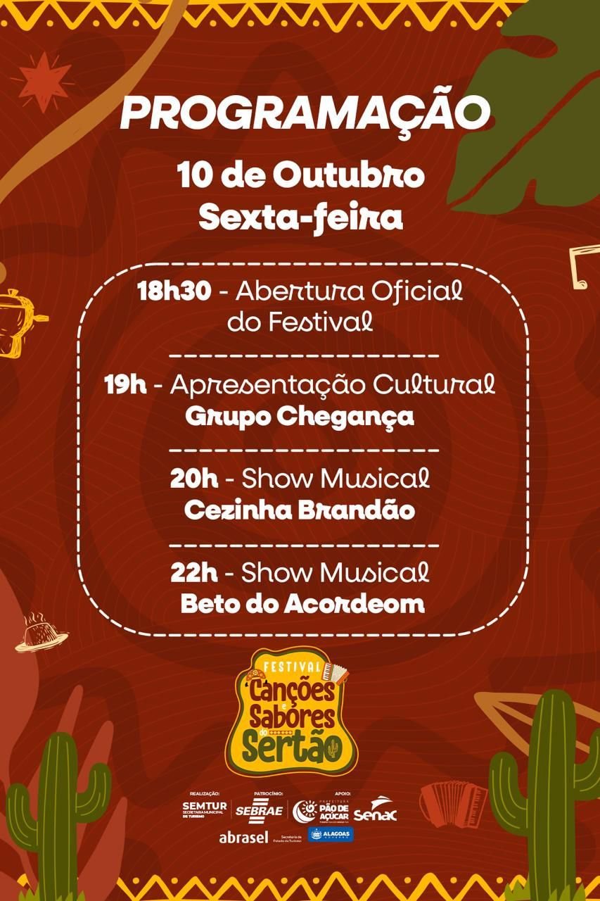 O município de Pão de Açúcar se prepara para viver um fim de semana de muita gastronomia, música e cultura com a realização do 1º Festival Canções e Sabores do Sertão, que acontece nos dias 10 e 11 de outubro, na Orla Fluvial, das 19h à meia-noite.