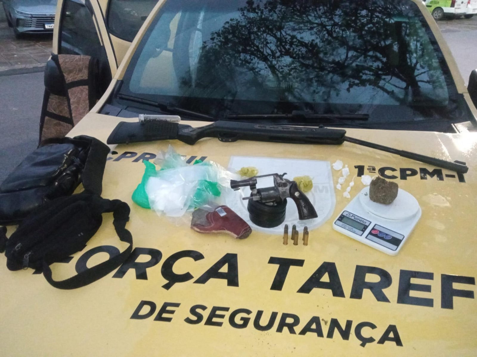 Em Arapiraca, guarnições de Rondas Ostensivas com Apoio de Motocicletas (Rocam) e do Canil do 3º BPM apreenderam, no bairro Primavera, uma pistola e uma quantidade de maconha, após uma abordagem a um veículo. O material estava em poder de três homens, que foram conduzidos à Central de Polícia da cidade.