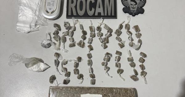 Após a revista, os militares constataram que a mochila continha um tablete de maconha pesando 720 gramas, 71 bombinhas da mesma substância totalizando 56 gramas, além de 22 gramas de cocaína e uma balança de precisão. O autor foi preso em flagrante.