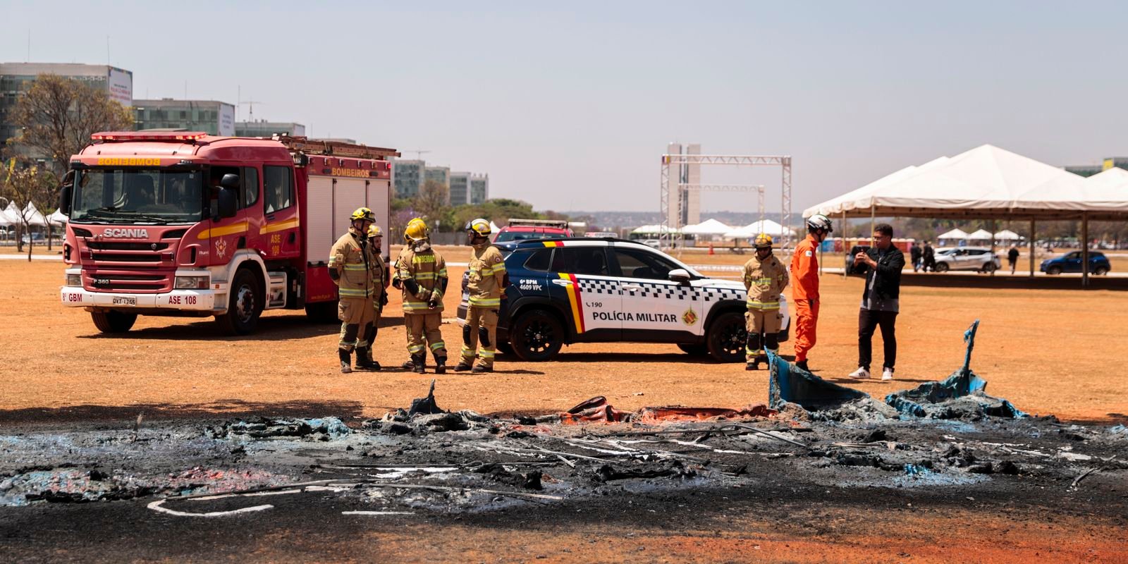 Dez banheiros químicos foram incendiados no gramado da Esplanada dos Ministérios no final da manhã desta terça-feira (9). O Corpo de Bombeiros do Distrito Federal controlou rapidamente as chamas, mas uma fumaça alta e escura ficou visível de vários pontos do centro da capital.