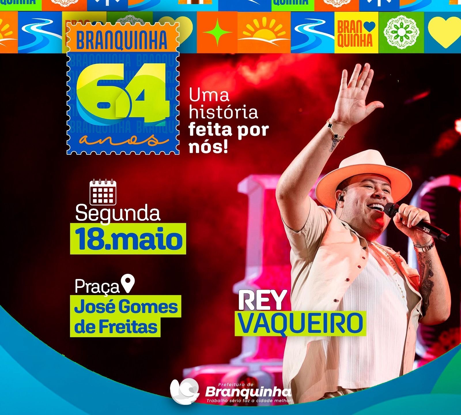 Celebrando 64 anos de história no próximo mês de maio, a prefeitura de Branquinha acaba de anunciar a primeira atração da grade artística do dia 18: o cantor Rey Vaqueiro. Com um forró diferenciado e dono de um repertório cheio de hits como “Body Splash”, “Estrela”, “Bem-vinda ao Meu Mundo”, entre outros, o cantor promete colocar todo mundo pra dançar na Praça José Gomes de Freitas – centro da cidade.