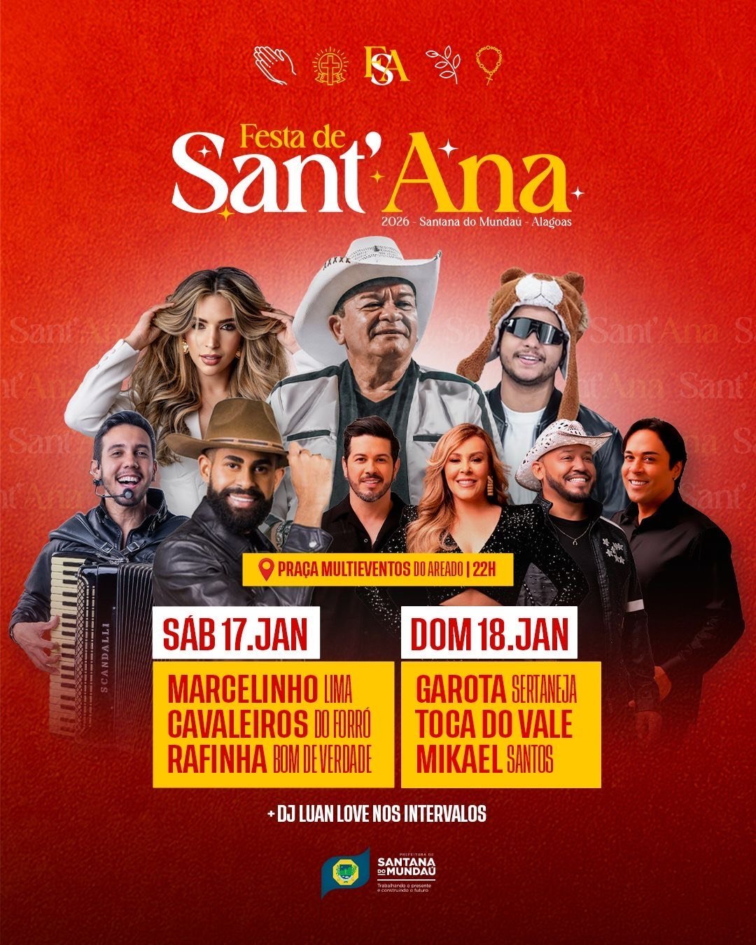 Entre os dias 9 e 18 de janeiro, o município de Santana do Mundaú celebra a sua padroeira, Senhora Sant’Ana. Paralelo aos festejos religiosos, a prefeitura acaba de anunciar a programação artística que fará a alegria dos mundauenses e visitantes nos dias 17 e 18.