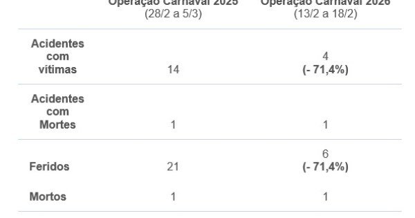 Nos cinco dias de Operação Carnaval, a PRF registrou queda nas principais estatísticas relacionadas à segurança viária, em comparação ao carnaval do ano passado. Entre os dias 13 a 18 de fevereiro de 2026, foram 4 acidentes de trânsito com 6 feridos e 1 acidente com 1 vítima fatal. Em 2025, foram 14 acidentes com vítimas graves e 21 feridos, além de 1 acidente com 1 vítima fatal. Comparando os dois anos, tivemos uma redução de mais de 70%.