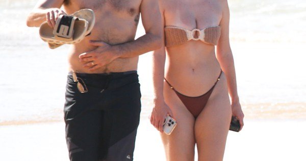 Recém-casado,, Gabriel O Pensador, de 51 anos de idade, curte dia de praia em Fernando de Noronha com a esposa Gabriela Vicente, de 24 anos.