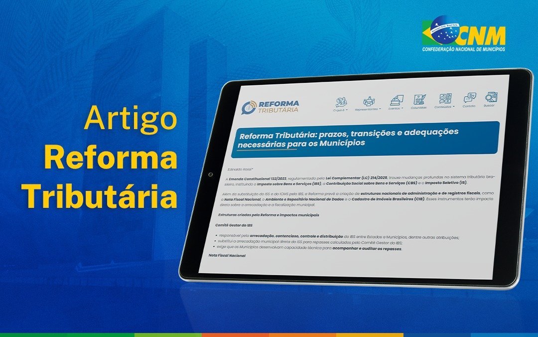 A Confederação Nacional de Municípios (CNM) traz um novo artigo no site da Reforma Tributária. O texto publicado nesta quarta-feira, 3 de setembro, é assinado pelo secretário-adjunto de Receita da Serra (ES), Edinaldo Rossi, e tem como tema Reforma Tributária: prazos, transições e adequações necessárias para os Municípios.