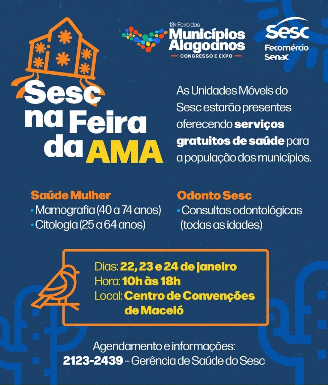 O SESC estará presente na 13ª Feira dos Municípios Alagoanos, também por meio de suas Unidades Móveis, oferecendo serviços gratuitos de saúde à população, conforme as faixas etárias abaixo: mamografia (mulheres de 40 a 74 anos), citologia (mulheres de 25 a 64 anos) e consultas odontológicas (todas as idades).
