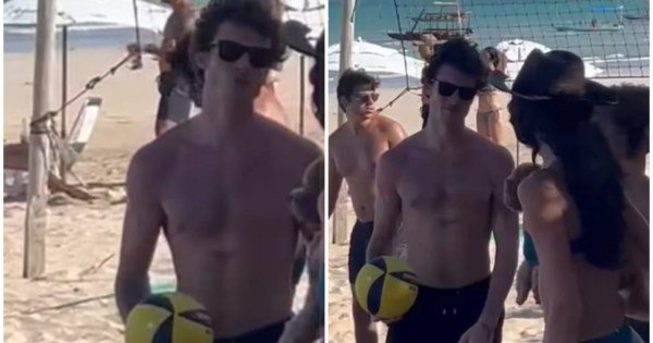 Shawn Mendes foi filmado jogado uma partida de vôlei em Alagoas com amigos. O cantor enviou um beijo para Bruna Marquezine, que conferia cada lance enquanto carregava sua cachorrinha Chihiro no colo. Assista ao vídeo: